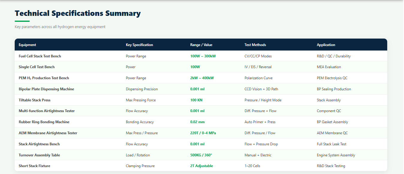 A comprehensive test bench supporting the full range of fuel cell stack testing from 100W to 300kW. Enables pressure/temperature sensitivity tests, start-up tests, steady-state, dynamic load, activation, durability, insulation tests, and polarization curve measurement. Features CV, CC, and CP operating modes with fully automated control.